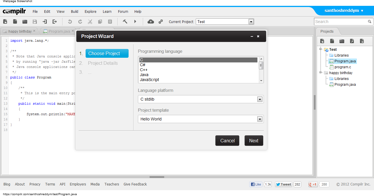 One of my friend has showed me an online IDE and compiler for C, C++, and Java programming languages. It's amazing, I've used it just to test the interface. I just thought I would share this so that you could try and use it.This online IDE has been named as "Compilr". One should register/sign in in order to use this fantastic service. It now supports different languages C, C++, Java, C#, JavaScript, Pascal, PHP, Python, Ruby, VB.